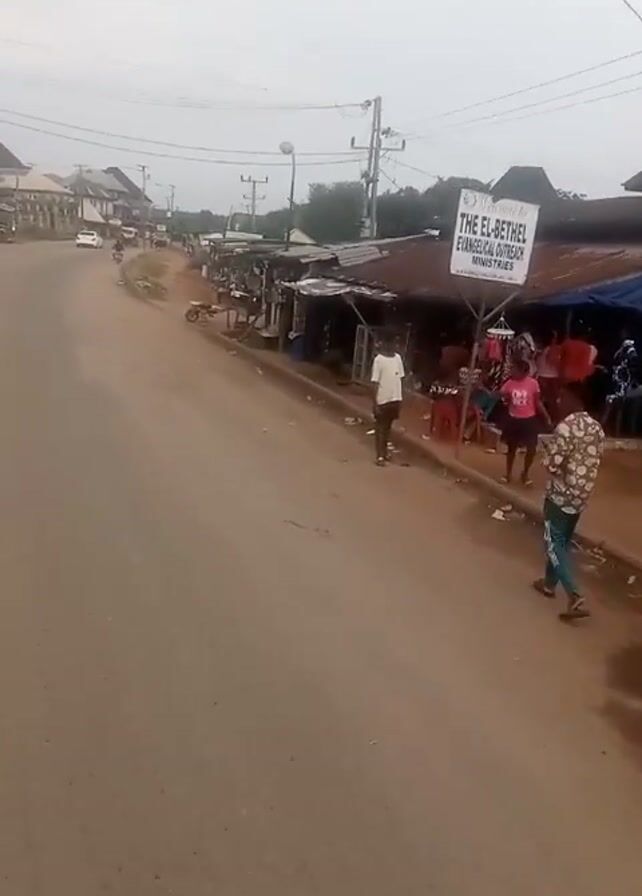 The video presents a street scene in what appears to be a rural or semi-rural area, under an overcast sky. The road stretches into the distance, with a car and motorcycle visible moving along it. Along the roadside on the right, there are several small, informal structures that seem to be shops or stalls, constructed with corrugated metal and wood. People are walking along the side of the road, some interacting near the shops. A sign reading "Welcome to THE EL-BETHEL EVANGELICAL OUTREACH MINISTRIES" is prominent on the right side of the frame. Power lines run above the street.
