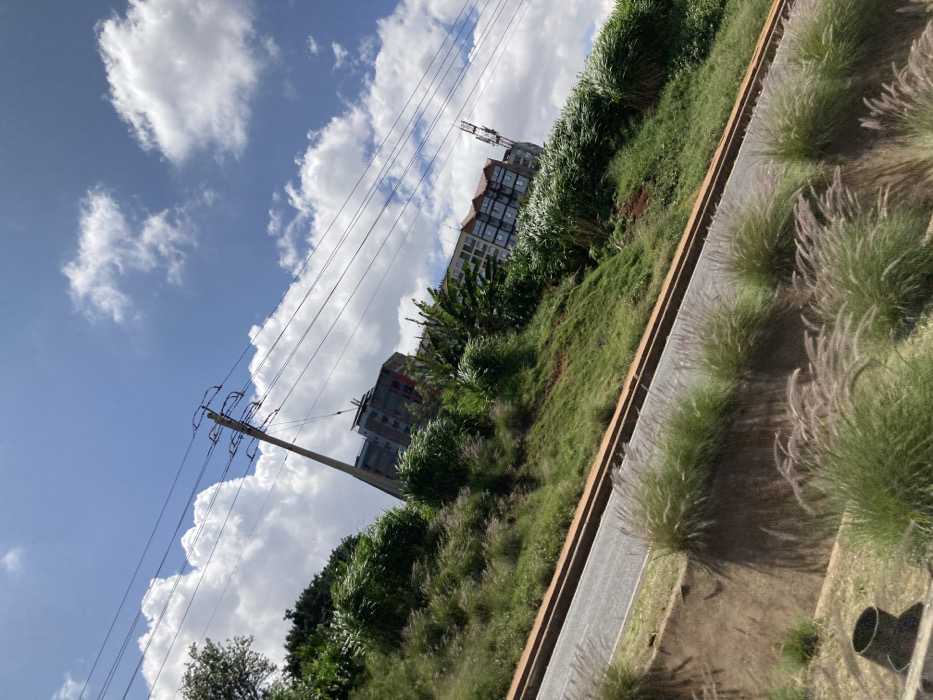The image displays an urban or suburban landscape in Nairobi, Kenya, under a bright, partially cloudy sky. The perspective is slightly tilted to the right, showing an upward incline. In the immediate foreground, a concrete and earth retaining wall supports several clusters of tall, feathery ornamental grasses. A dark, cylindrical object, possibly a drainage fixture or pipe, is partially visible at the bottom-left. Above this embankment, a narrow, paved road with a distinct curb traverses diagonally across the midground. Beyond the road, a steep, green hill covered with dense vegetation, including manicured grass, various shrubs, and broad-leafed plants, slopes upwards. In the background, under a blue sky with scattered white cumulus clouds, several multi-story structures and utility infrastructure are present. To the left, a tall building with reddish-brown and grey facades appears to be under construction or renovation, with visible scaffolding or netting. To the right, another multi-story building, consistent with a modern apartment complex, features a prominent brownish-red gabled roof section and numerous windows. A tall wooden utility pole with multiple overhead power lines extends diagonally across the upper portion of the frame. A cellular or communication tower is visible on the far right, positioned near the modern residential building. No individuals or discernible actions are present.
