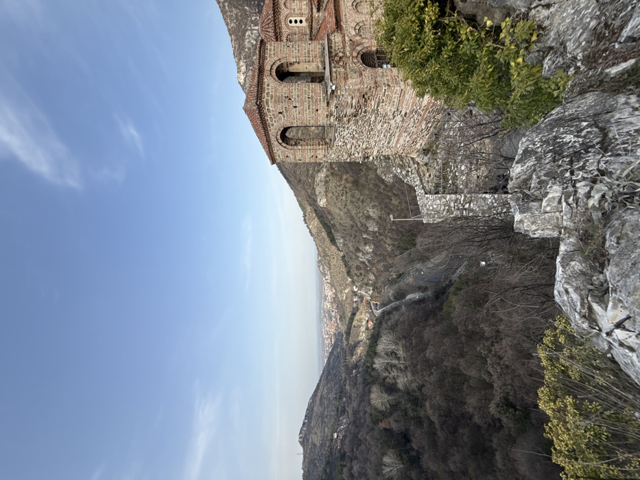 The image displays a high-angle panoramic view overlooking a valley and city in Asenovgrad, Bulgaria