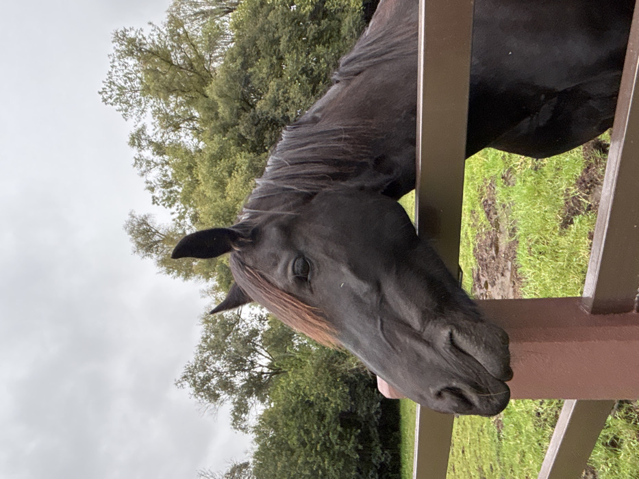 - "A dark brown horse is depicted in a close-up, profile view, resting its head and neck on a painted fence railing in an outdoor, pastoral setting" by FM-LuzOX2, licensed under CC BY 4.0