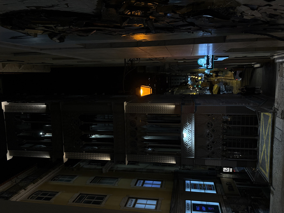 The image depicts a street scene at night, rotated 180 degrees. A building with ornate architectural details and illuminated windows dominates the view. A street lamp casts an orange glow nearby. Further down the street, a "Normal" sign is visible amidst the city lights. The street appears narrow, with glimpses of traffic and other buildings in the distance. The pavement and surrounding infrastructure are also visible, contributing to the urban setting.