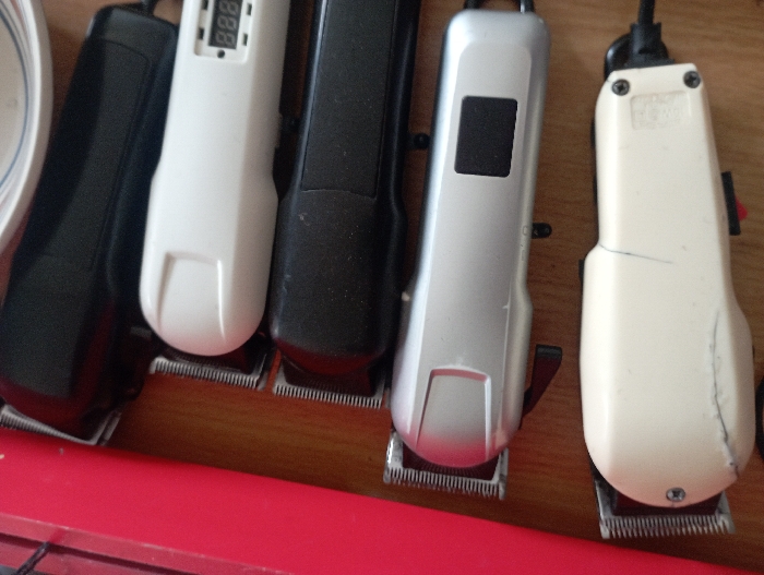 - "Five hair clippers rest on a wooden surface with a red edge" by FM-4h3WA2, licensed under CC BY 4.0