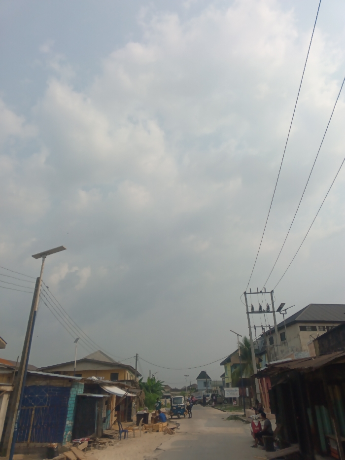 A dusty road stretches between modest buildings under an overcast sky. Power lines crisscross above, supported by utility poles and extending into the distance. People are visible along the roadside, some sitting and others gathered near a small blue vehicle. Makeshift stalls and structures line the road, suggesting a bustling yet informal setting. The scene evokes a sense of everyday life in a developing urban environment.