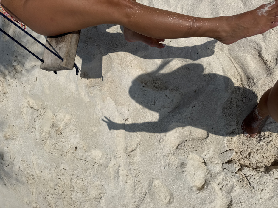 A person is sitting on a makeshift chair on the beach, with legs extended. Sunlight casts shadows of the person and a "peace sign" hand gesture onto the light-colored sand. The chair, possibly constructed from wood and rope, is also shadowed. Patches of uneven sand textures surround the shadowed figure.