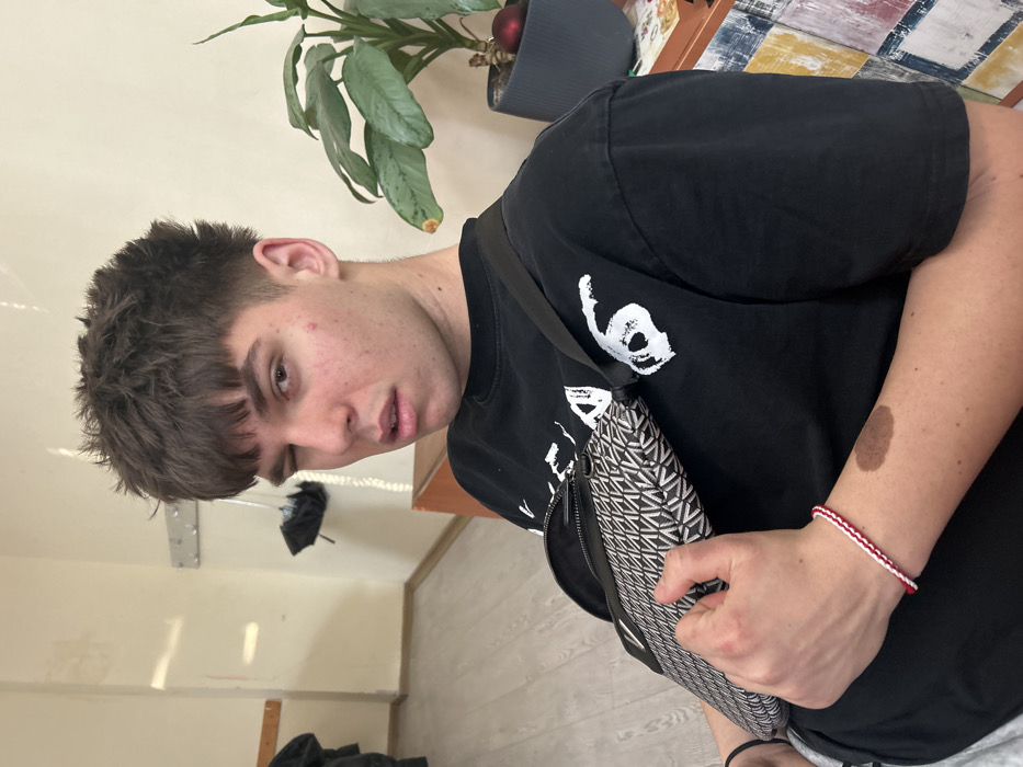 A young adult male with dark brown, spiky hair, light skin, and a visible birthmark on his left forearm is depicted indoors. He is winking with his right eye and has his mouth slightly open, looking towards the viewer. He wears a black short-sleeved t-shirt with a white graphic print on the front and a black messenger bag with a white and black geometric pattern slung across his chest. His left hand rests on the bag. A red and white braided bracelet is on his left wrist. The background features light cream-colored walls, a light wooden floor, and a wooden baseboard. On the left, a dark object, possibly an umbrella, hangs from a wall-mounted hook. On the right, a potted green plant with partially yellowed leaves and a small red spherical ornament sits on a light brown wooden surface, below which a multi-colored, patterned panel is visible. The specific location within the city of Haskovo, Bulgaria, is not discernible from the image.