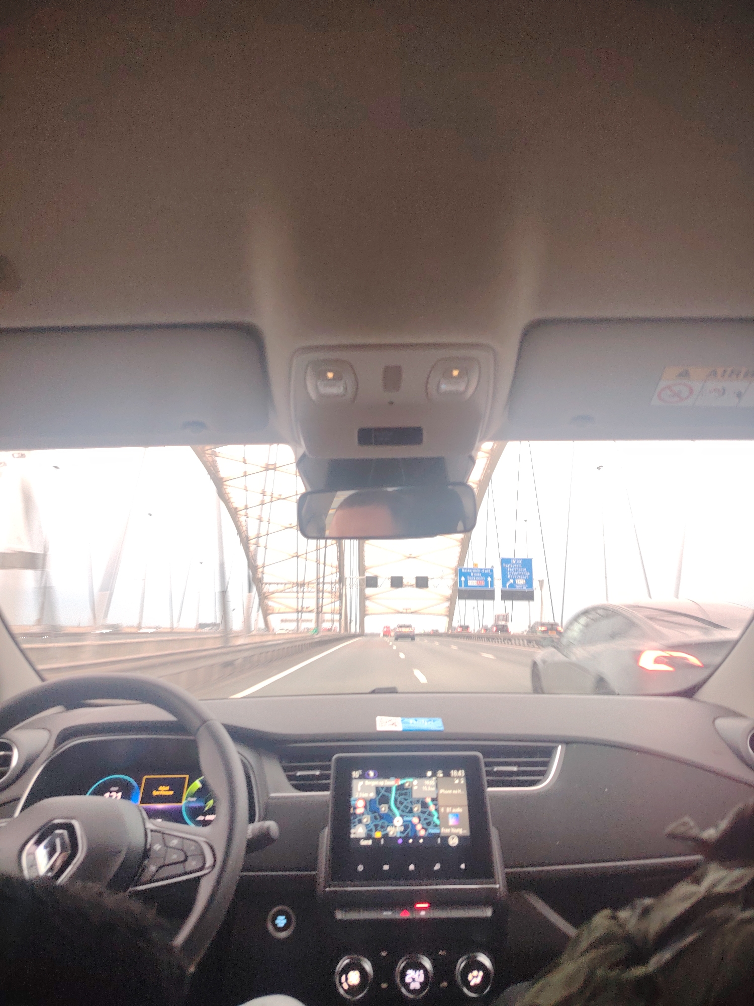 The image presents a first-person view from inside a Renault vehicle, likely a Renault Zoe, traveling on the A16 motorway across the Van Brienenoordbrug in Rotterdam, Netherlands