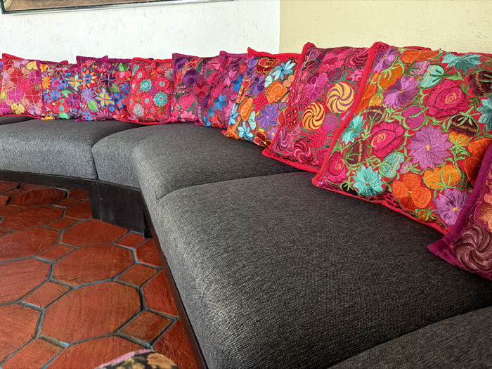 A modern, charcoal gray curved sectional sofa is adorned with a vibrant display of embroidered pillows. The pillows feature a variety of colorful floral designs in shades of pink, red, orange, and blue, each trimmed with a bright red piping. The sofa sits on a dark base, contrasting with the patterned terracotta tile floor. A white wall is visible in the background, partially obscuring what seems like a painting.