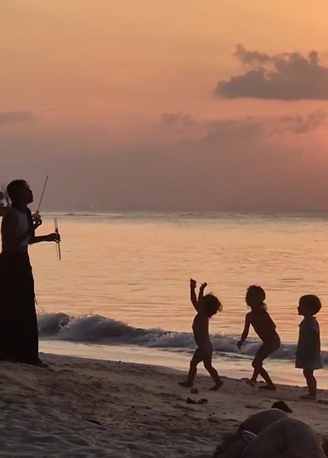 At sunset on a beach, a silhouetted adult stands on the sand holding objects, while three children play nearby