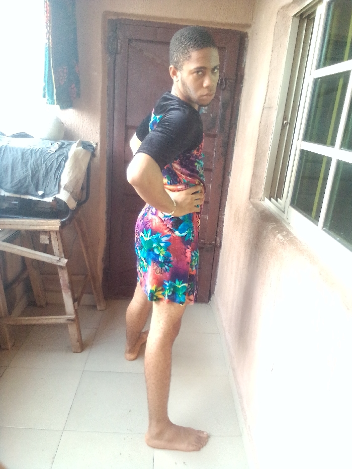 A male individual with short dark hair and stubble stands barefoot on a light-colored tiled floor, posing for a photograph. The subject wears a black long-sleeved shirt layered beneath a sleeveless, vibrant floral-patterned dress in shades of pink, orange, blue, and green, and a thin, light-colored bracelet on the right wrist. The individual's body is turned slightly to the left, with the head rotated to face the camera directly over the left shoulder, and the right hand positioned on the hip. The background features a dark wooden door to the left of the subject and a light-colored wall with a window and white frames to the right. A wooden stool topped with dark fabric is visible on the far left. The scene is an interior or covered exterior space, such as a balcony or porch, in Unknown, Unknown, illuminated by natural light.
