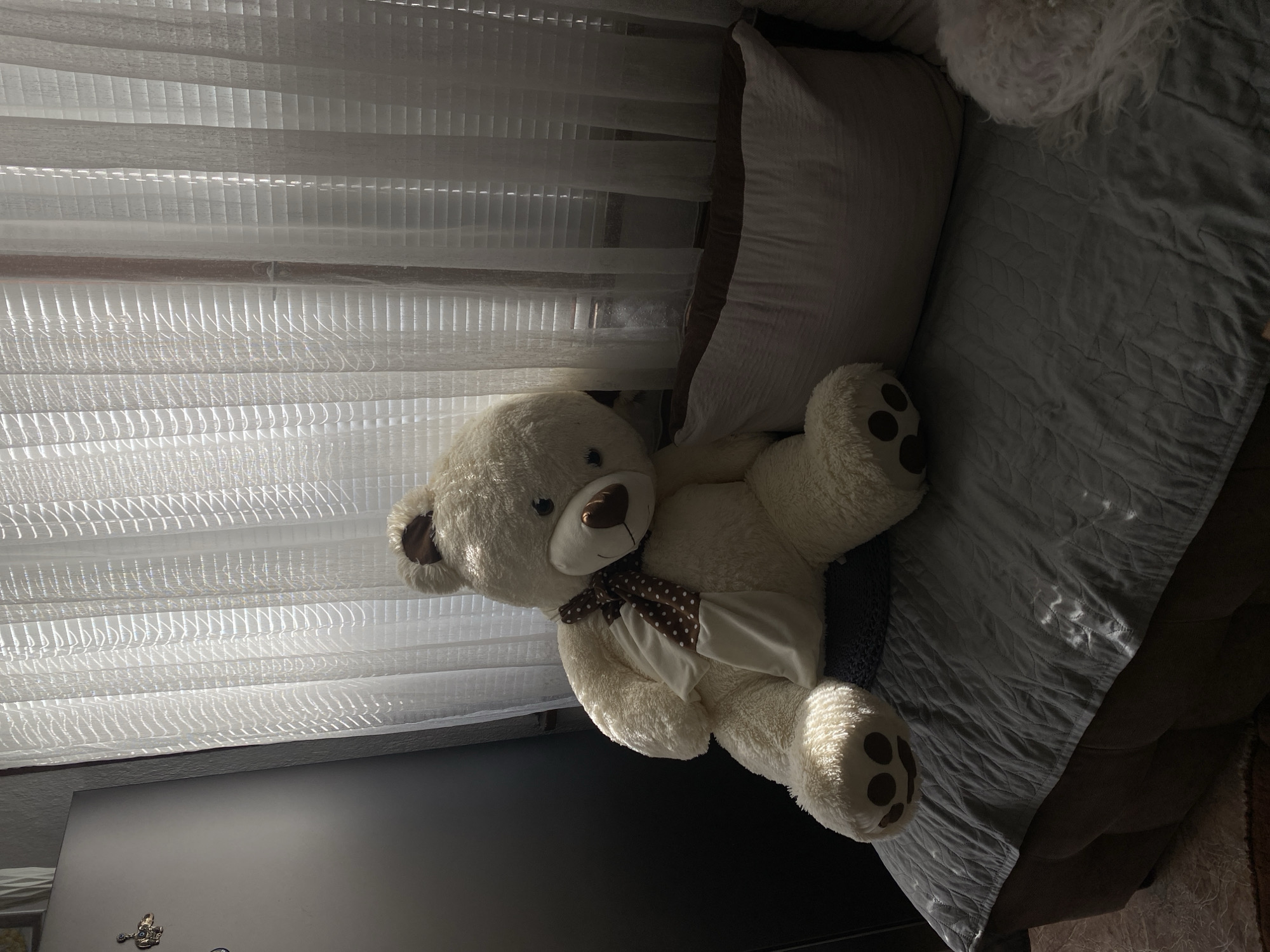 light-colored teddy bear with a brown polka dot bow tie lying on a bed with a gray comforter. The bed has a pillow at the head, near a window covered with white blinds. The scene is indoors and appears to be lit by natural light filtering through the blinds. The lower left corner of the image includes a dark wall, potentially part of a closet or cabinet. The location is not identifiable as Blagoevgrad, Bulgaria from the visual information in the image.