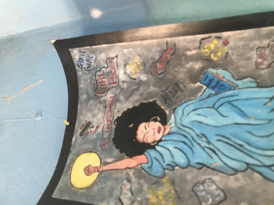 An artwork is affixed to a light blue, imperfect wall with visible chips and paint splatters on Rukuba Road, Nigeria. The artwork features a stylized dark-skinned female figure with a large black afro, dressed in a light blue flowing robe, resembling the Statue of Liberty. Her right arm is raised, forming a fist, holding a circular yellow object. Her left arm cradles a blue book. Her eyes are closed, and her mouth is slightly open. The background within the artwork is grey and textured, featuring various motivational texts and symbols. Prominent text includes "GIRL POWER," "BRAVE GIRL," and "AM UNSTOPPABLE." A drawing of a black handgun with the text "FIGHT LIKE A GIRL" is also visible. Other faint text includes phrases like "Girls life" and "Star Cafe." The artwork has a dark frame and appears to be slightly bowed outwards. A yellow thumbtack is visible near the top left of the frame.