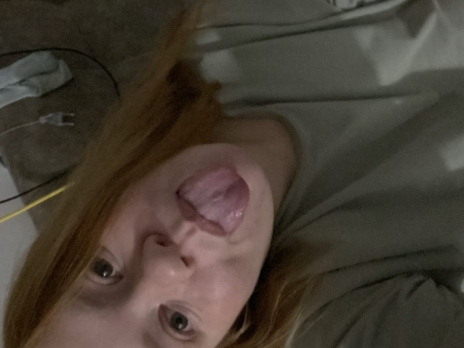 A pale-skinned person with light brown hair is seen with their tongue extended. The person’s face is pale with freckles. A gray cloth is visible in the background. A medical cable and mask are in the background, suggesting a hospital setting.