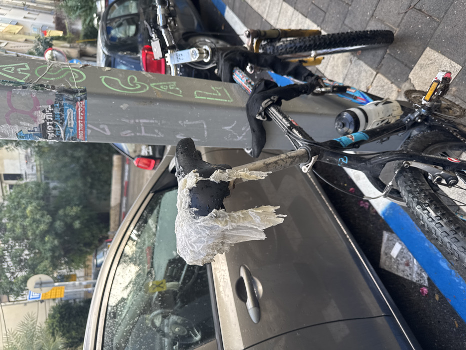 A mountain bike is secured with a black chain lock to a gray pole. The bike has a water bottle and a black seat mostly covered in shredded white plastic. The bicycle and pole lean against a gray car. A blue stripe is painted on the ground next to the car. Green trees and other cars are visible in the background.
