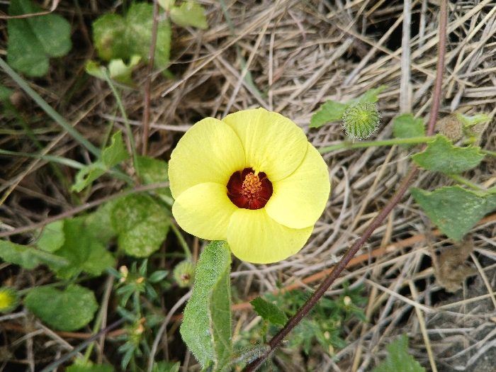 A single, vibrant yellow flower, approximately 4 cm in diameter, is centrally positioned. It features five rounded petals and a prominent dark reddish-brown center with a cluster of orange-yellow reproductive structures. The flower is attached to a thin, reddish-brown stem with visible fine hairs. To its immediate left, a portion of a green, textured leaf is visible. Below and to the right, a spherical, green, textured bud, approximately 1 cm in diameter, protrudes from another stem segment. The background consists of a dense layer of dry, light brown, interwoven grass blades and plant detritus, interspersed with small patches of living green foliage. The scene is illuminated by ambient light. This botanical observation was recorded in Ciudad Guayana, Venezuela.