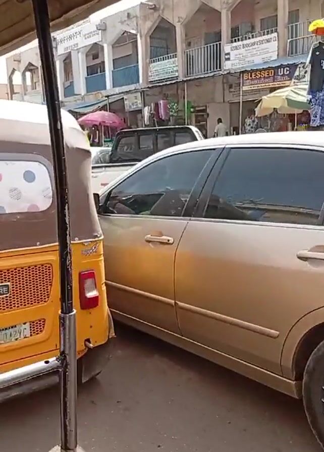 view from inside a tricycle in a busy street. The tricycle is yellow and brown and has a license plate that reads GRE-032VC. Next to the tricycle is a gold-colored car with custom black rims. The street is lined with buildings, some of which have signs for businesses such as "INFINITY" and "BLESSED JOSHUA & STATIONERY CO". There are also other cars and pedestrians visible in the background. The tricycle starts up and begins to move slowly through traffic.