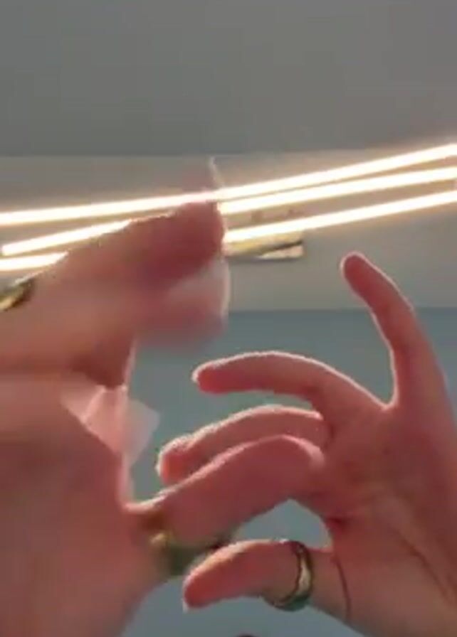 A person is holding their hands up towards the camera, showing several rings on their fingers. The rings are of different styles and colors, mostly gold and green. The person moves their hands around to display the rings from various angles. Behind the hands, a modern light fixture with several parallel light bars is visible against a light blue wall. The lower part of the person's face, including their eyes and hair, is also in the frame.