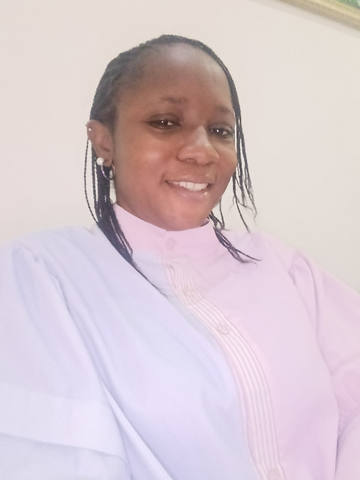 A single adult female is depicted in a close-up, chest-up portrait. She possesses dark skin, dark braided hair framing her face, and a smiling expression with visible teeth. Her left ear is adorned with a hoop earring featuring a white pearl. She is wearing a light-colored, long-sleeved collared shirt or blouse, which appears to be a combination of very light pink and white, with vertical stripes on the button placket. The background consists of a plain, light-colored wall. A small, indistinct, gold-toned object or frame is partially visible in the upper right corner of the frame. The image does not contain any visual information to determine a specific location within the city of Gwarinpa, Nigeria.