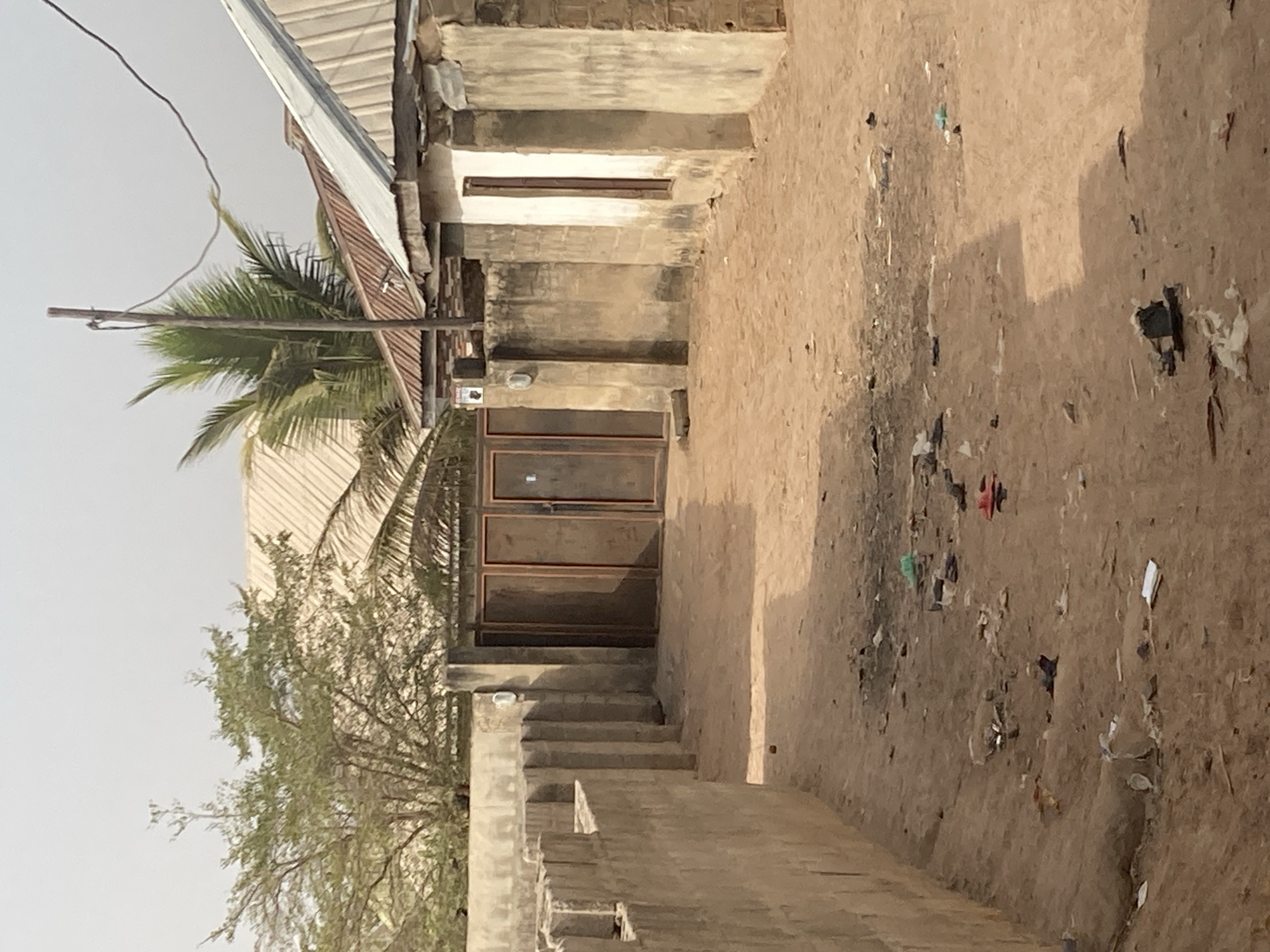 The image depicts a street scene in Minna, Nigeria. The ground is dirt with scattered debris. Buildings line the street, constructed from what appears to be concrete or mud brick. One building has a corrugated metal roof and a doorway accessible by a short flight of concrete steps. A palm tree and another smaller tree are visible near the buildings. A power line runs across the sky. The sky is overcast and a light haze pervades the scene.