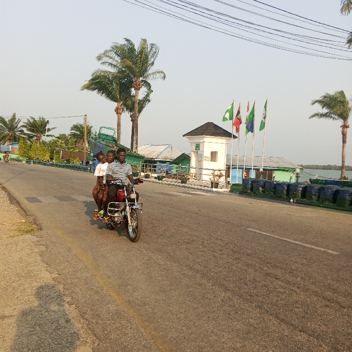 - "A daytime scene in Koko, Nigeria, depicts three individuals riding a red and chrome motorcycle on a paved road" by FM-zGgZ32, licensed under CC BY 4.0