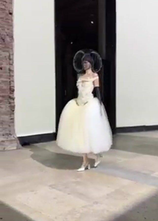 A video shows a model walking during a fashion show. The model is wearing a cream-colored, off-the-shoulder dress with a large, full skirt. The bodice of the dress is decorated with white, floral-like embellishments. The model wears black, elbow-length gloves and light-colored, low-heeled shoes. A large, black wire structure, covered with a dark veil, adorns the model’s head. The model walks on a light-colored, tiled floor past white walls, a brick pillar, and a large, dark doorway. Light from overhead shines on the model and floor. The video is shot in a shaky, handheld style.