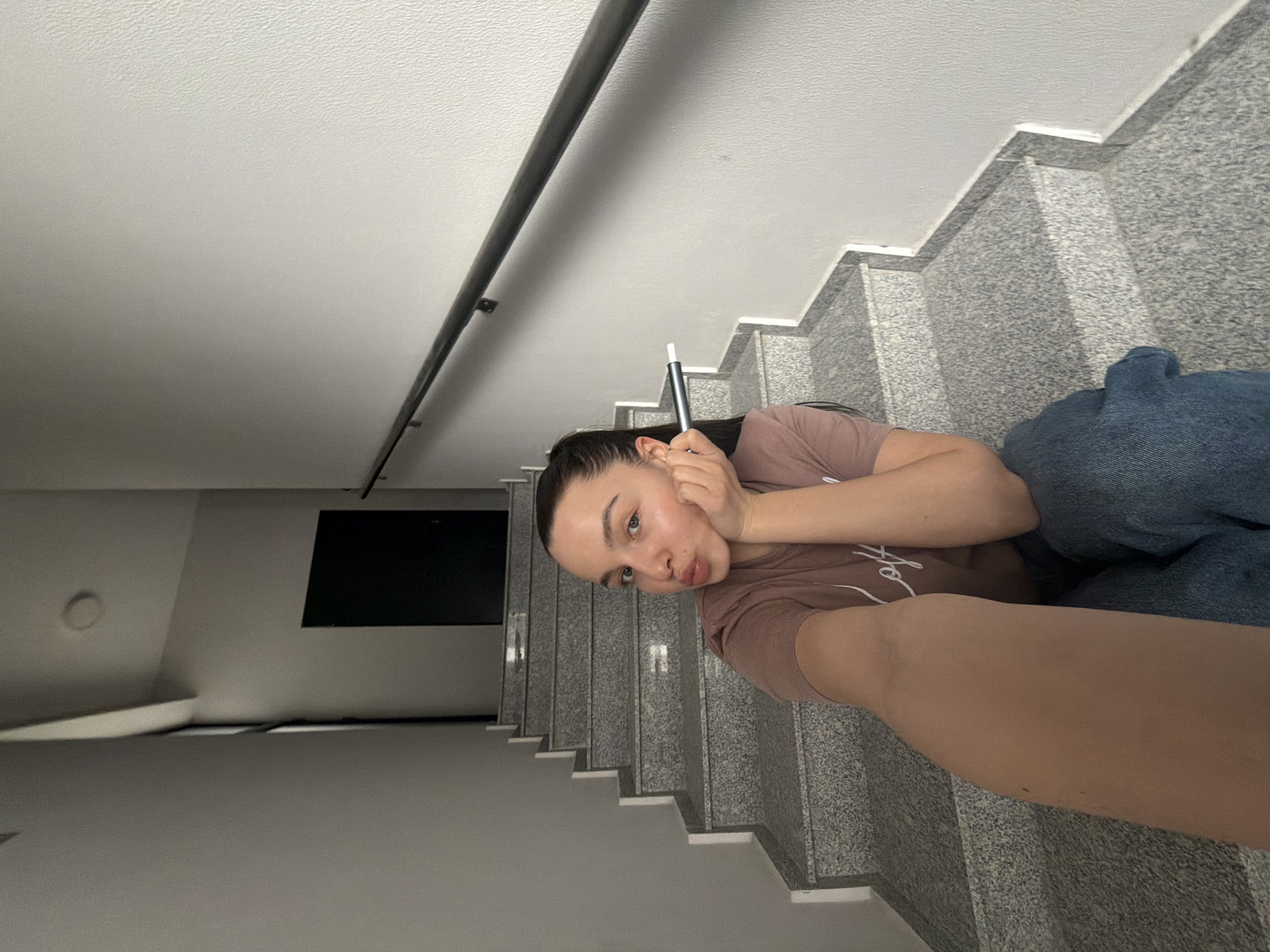 A young woman is posing for a selfie on a staircase. The staircase is made of gray granite-like material, and the woman is sitting on one of the steps, wearing a brown t-shirt and blue jeans. She is holding a vaping device in one hand, which she is holding near her face. The staircase appears to be indoors, possibly in an apartment building or office building in Sofia, Bulgaria, given the architectural style. A black metal railing runs along the ceiling above the staircase. A white ceiling is above the railing. On the left side of the frame is a hallway, and a black rectangle is visible on the wall, possibly a TV.