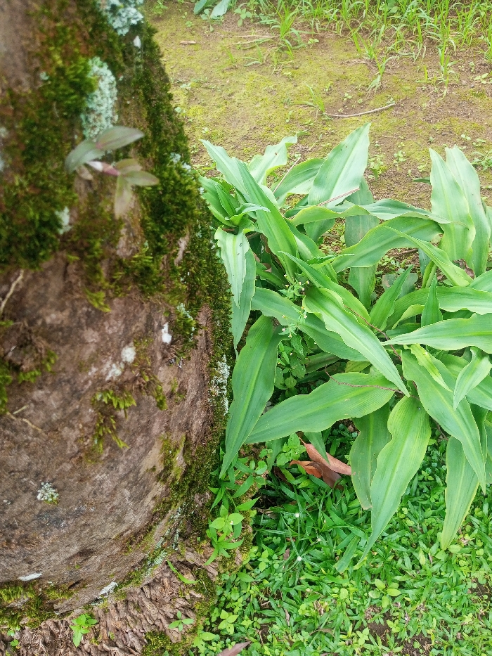 The image displays a close-up, outdoor ground-level scene in Nghĩa Đồng Commune, Vietnam. The left side of the frame features a thick, rugged tree trunk, heavily covered with vibrant green moss and scattered patches of pale blue-green lichen. A small plant with reddish-green leaves grows out of the moss on the upper portion of the trunk. To the right, a large, lush plant dominates the midground, characterized by numerous broad, elongated, light green leaves, some exhibiting lighter striations. Small white flower buds are visible near the base of this plant. The ground surrounding the tree and the large plant consists of a mix of short green grass, various small green groundcover plants, and patches of exposed dark brown soil. Several dry, brown fallen leaves are present on the ground. The background, particularly in the upper right, shows a less dense area of soil with sparse, short green sprouts. No individuals or direct interactions are depicted.
