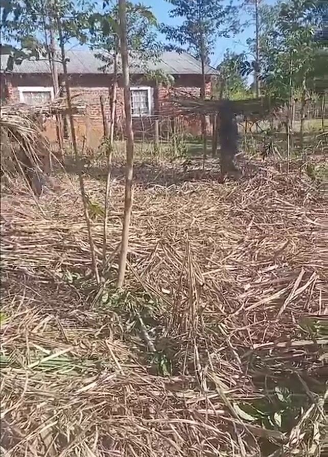 several people working on a large pile of dry sugar cane stalks. They are standing on and around the pile, presumably loading it onto a tractor or truck that is partially visible in the background. The area around the pile is covered in dry stalks. There is a simple brick building with a white-framed window in the background, and trees are scattered around the area under a clear blue sky. The individuals are dressed in casual clothing. The video appears to be taken during daylight hours in a rural or agricultural setting.
