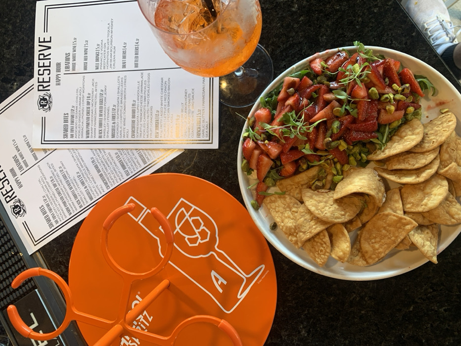 A restaurant table displays a menu with "Reserve" and "Shared Bites" headings, listing appetizers like tuna tartare, deviled eggs, and mussels. An Aperol spritz cocktail and an orange Aperol coaster are visible. A white plate holds a strawberry salad with green toppings and a pile of tortilla chips. The setting is a restaurant or bar.