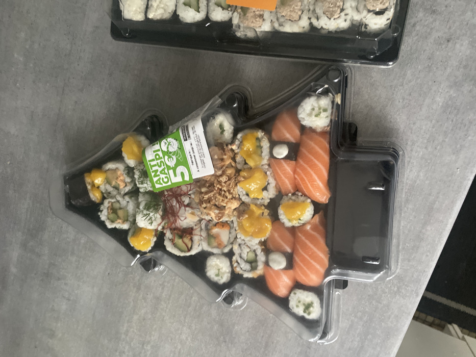 The image depicts two plastic containers of sushi displayed on a light gray, textured countertop surface within an indoor location in Caen, France. The prominent object is a clear plastic container, molded into the shape of a Christmas tree with a black base, positioned on the left. This container is filled with an assortment of sushi and maki rolls. Visible contents include salmon nigiri, various maki rolls with fillings such as avocado or cucumber, toppings like yellow fruit (likely mango), green herbs (possibly dill or chives), a reddish garnish, and a mound of crispy fried ingredients. A green and white "ANTI GASPI!" label, indicating a reduced price of "5 €" and featuring French text regarding production date, consumption deadline, and storage conditions, is affixed to the clear lid of this container. To the right, a portion of a second, rectangular black plastic sushi tray with a clear lid is visible, containing additional maki rolls. A small orange sticker is present on this partially visible container. The background is out of focus, showing a wall or similar surface, and a dark, striped object is partially visible in the lower-left foreground. No individuals are present in the scene.