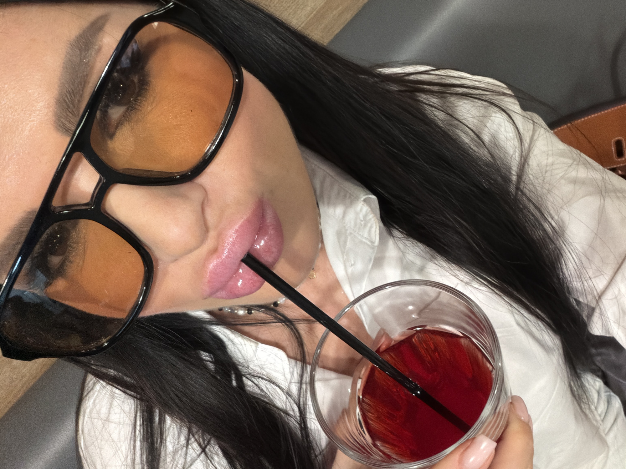 A woman with long, dark hair is shown from a high-angle, close-up perspective. She is wearing large, black-framed sunglasses with amber-tinted lenses, and a white collared shirt. The woman is holding a glass of red liquid, likely a beverage, with a black straw in it. The straw is positioned in her mouth as if she is drinking from it. Her lips appear full and have a glossy texture. The background includes a wooden-look surface and grey upholstery, suggesting an indoor setting, possibly a cafe or bar. There is also a brown handbag to the right. There is no information to suggest the location of the image.