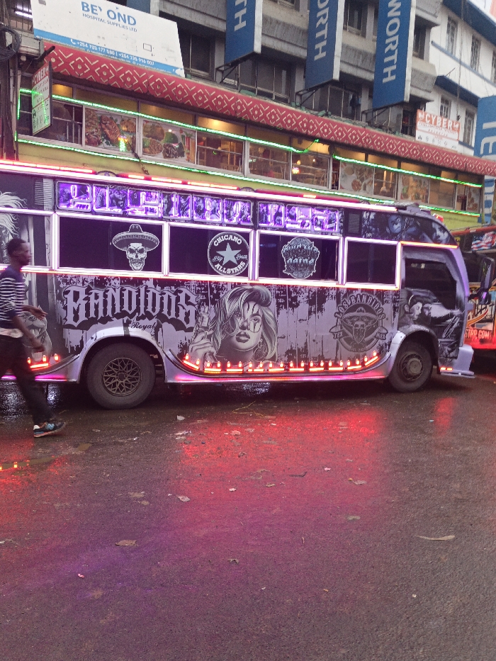 - "The image depicts a highly customized matatu, a public transport minibus, positioned on a wet asphalt street in a commercial district of Nairobi, Kenya" by FM-c1BvP2, licensed under CC BY 4.0