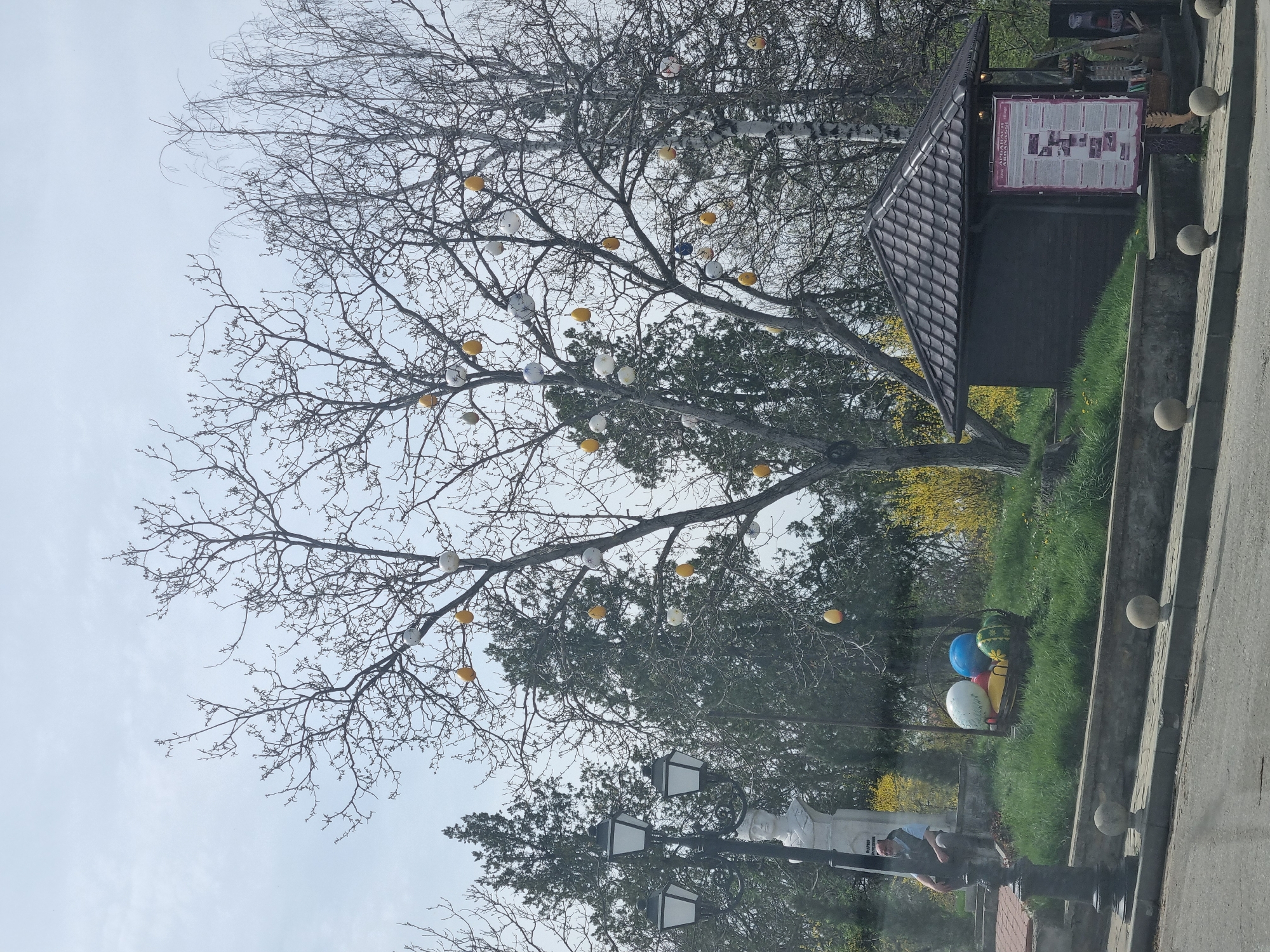 scene in Arbanassi, Bulgaria. A bare tree is decorated with yellow and white spherical ornaments. Next to the tree is a small, dark-colored wooden structure with a tiled roof and an informational sign attached. Beyond the structure is green vegetation, including grass and flowering bushes. In the foreground, on the right side of the image, is a concrete curb lined with spherical concrete posts. Further back, there's a basket filled with colorful, large spheres. A lamp post and a statue are also visible in the background. A person is seen standing near the lamp post.