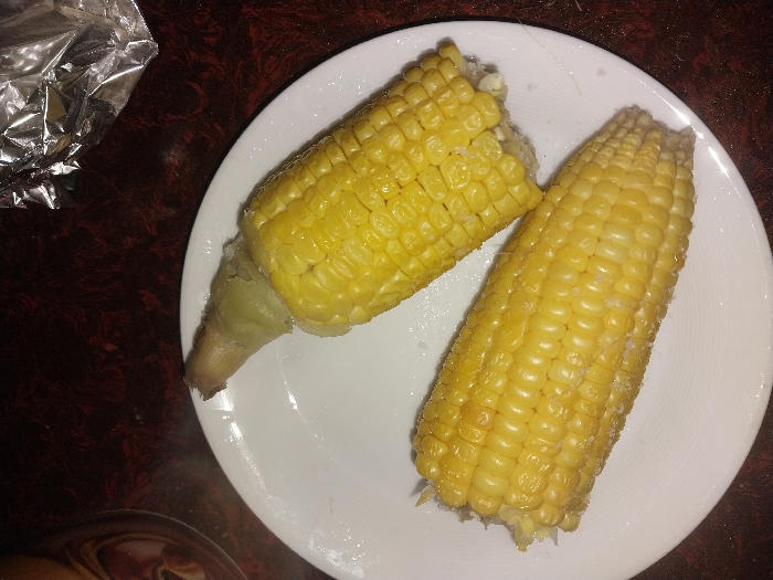 - "The image displays two cooked ears of corn on the cob, presented on a white, round plate" by FM-2XCCl2, licensed under CC BY 4.0