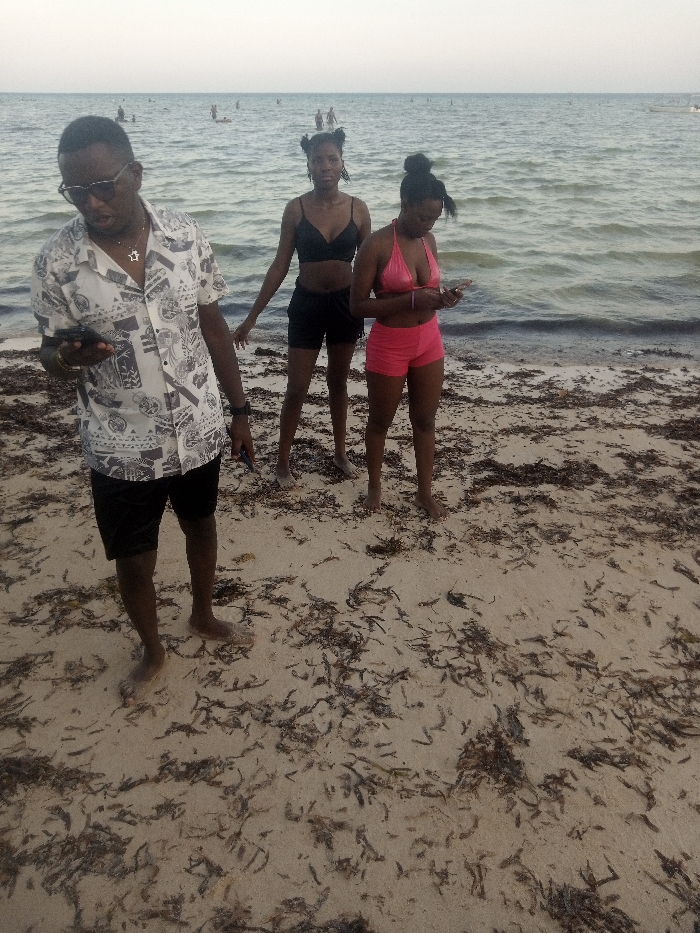 The image displays three individuals standing barefoot on a sandy beach in Shanzu ward, Kenya. The light-colored sand in the foreground is strewn with dark, dried seaweed. On the left, a dark-complexioned male wears sunglasses, a white and grey patterned short-sleeved button-up shirt, and black shorts, adorned with a star-shaped pendant. He holds a dark smartphone in his left hand and looks downwards. In the center, a dark-complexioned female wears a black bikini top and black shorts, with her hair styled in two prominent buns; she faces forward with her arms slightly bent. On the right, a dark-complexioned female wears a shiny pink bikini top and matching pink shorts, with her hair in a top knot, holding a light-colored smartphone with both hands while looking downwards. In the background, the ocean features calm, rippling water, with several other individuals visible swimming or wading further out under a pale, light-colored sky.
