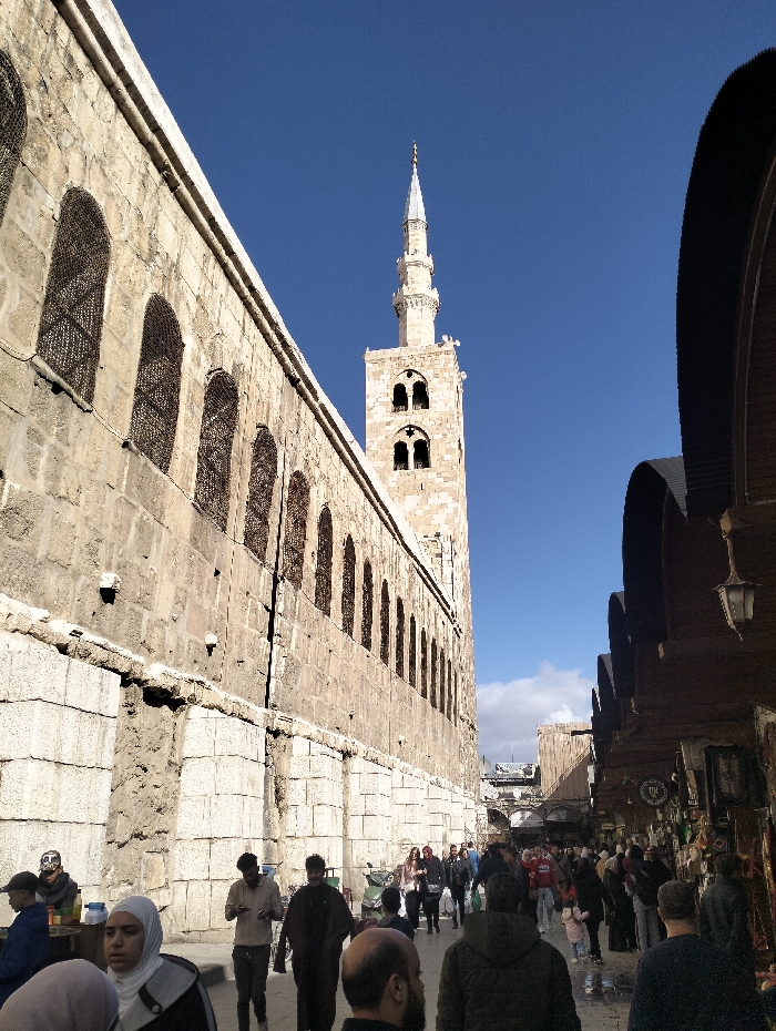 An outdoor scene in Damascus, Syria, captures a bustling street adjacent to the Umayyad Mosque