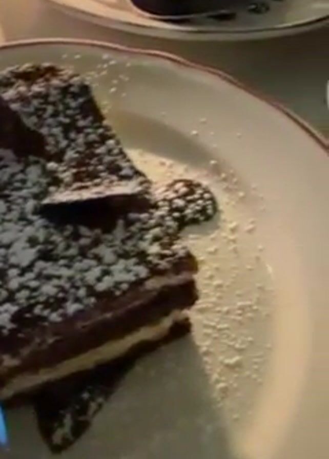 table with plates of dessert. There are three plates in view. One plate contains a rectangular chocolate cake with powdered sugar on top. Another plate has a slice of cheesecake topped with strawberries and a scoop of vanilla ice cream. The third plate holds a piece of dark chocolate cake. A person's hands are briefly visible in the background. The table is covered with a white tablecloth. The plates have a white center with a thin red border.