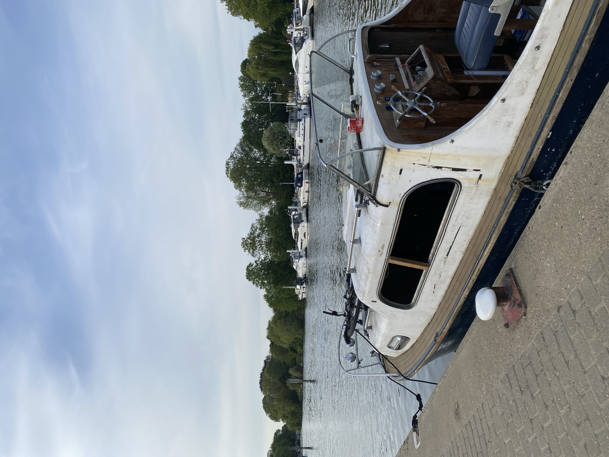 close-up of a docked boat in Elmbridge, United Kingdom. The boat is primarily white with a wooden interior and a blue trim along the edge. It appears to be an older model and is tied to a gray concrete dock. In the background, a line of similar boats is visible, docked along the tree-lined riverbank. The sky is overcast. A metal mooring bollard is visible on the dock next to the boat.