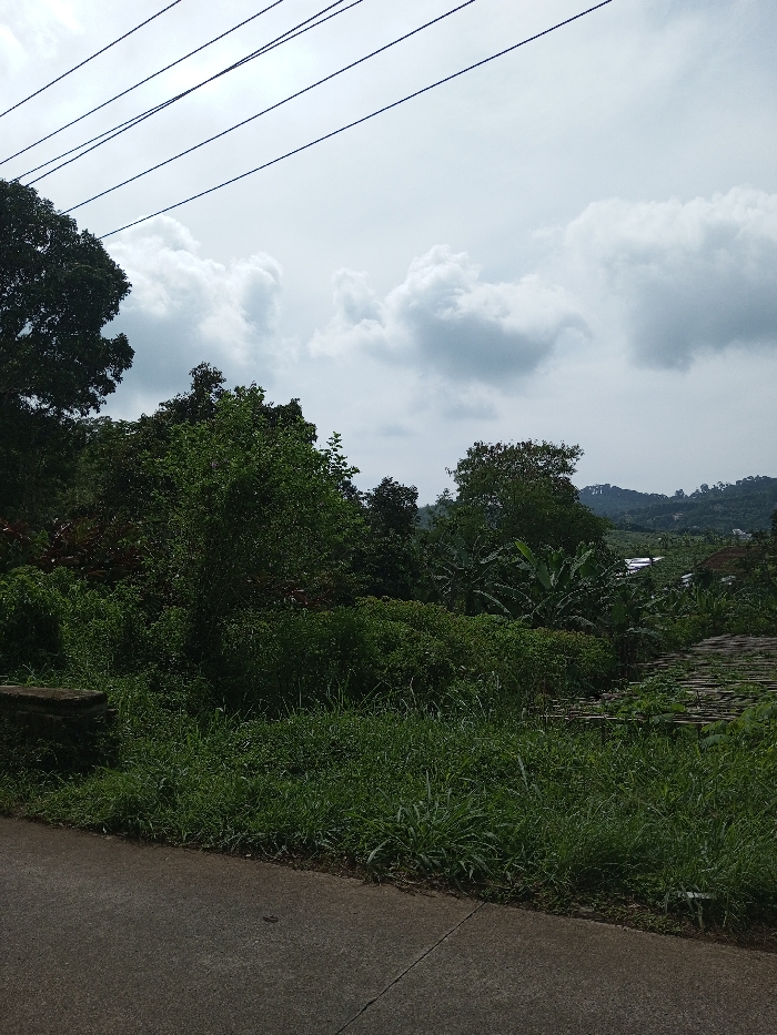 The image displays an outdoor scene in Kandenuwara, Sri Lanka, characterized by a dominant natural landscape under an overcast sky. The upper portion of the frame features a light grey sky with scattered white and grey cumulus clouds. Five dark, parallel utility lines traverse the upper left quadrant of the sky diagonally, from left to right, descending slightly. The middle and lower portions of the image are densely vegetated. In the immediate foreground, a dark grey paved surface, consistent with a road or path, extends across the bottom fifth of the frame. A faint linear crack is visible on this surface, running from the bottom left towards the center. Adjacent to the paved surface, a strip of short green grass and weeds forms a natural border. Behind the grass strip, a low, rectangular concrete or stone block is partially visible on the far left. The midground consists of a dense array of diverse green foliage, including tall, dark-leafed trees on the left, various shrubs, and broader-leafed plants, possibly banana trees, towards the right. Further into the midground and background, dense layers of vegetation continue, forming a lush, hilly landscape. Faintly visible among the greenery in the right midground are sections of what appear to be rooftops of structures, some light-colored, suggesting distant buildings. A distinct, low-lying lattice-like structure made of thin horizontal poles or beams is present on the ground amidst the dense vegetation in the right midground. In the far background, verdant hills rise against the horizon. No people, animals, or explicit actions are present within the scene.