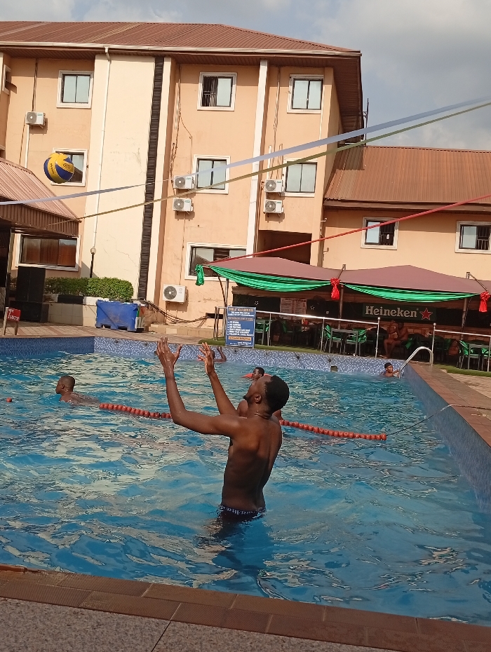A group of people swim in an outdoor pool next to a building with multiple windows and air conditioning units. A man stands in the pool with his arms raised, possibly about to catch a ball. A volleyball hovers in the air. A covered seating area is visible behind the pool, displaying the Heineken logo. Colorful streamers decorate the surrounding area.