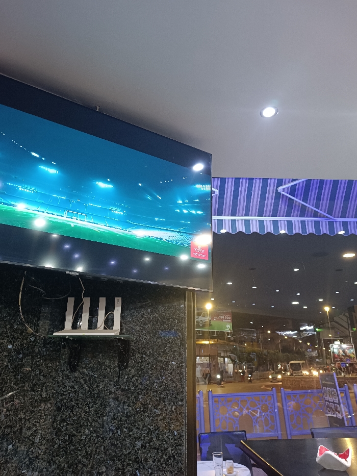 A television displays a vibrant stadium scene, mounted on a dark, speckled wall. Below, a white router sits on a small glass shelf. Outside, a street scene is visible with lighted buildings, a billboard, and passing cars. Tables and chairs are arranged near a window, suggesting a cafe setting. A blue and white striped awning is partly visible.