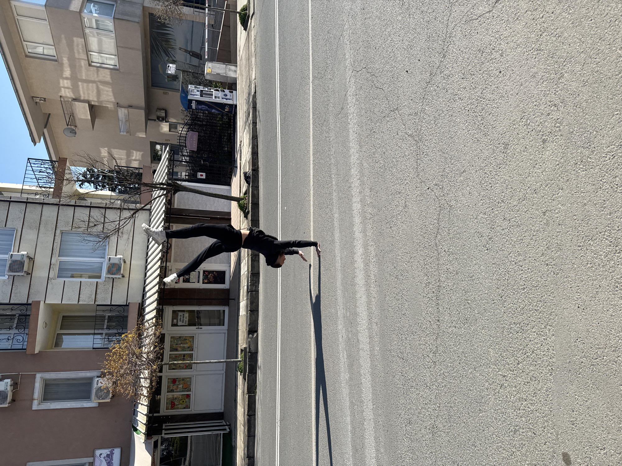 A person is lying horizontally on their side on a city street, appearing to perform a gymnastic pose. The person is wearing black clothing and white sneakers. Their shadow extends along the street. The street is gray and has two white lines dividing it. A building is visible on the left side of the frame. The building has multiple windows and air conditioning units. There is a storefront on the ground floor of the building. The location is the city of Primorsko, Bulgaria.