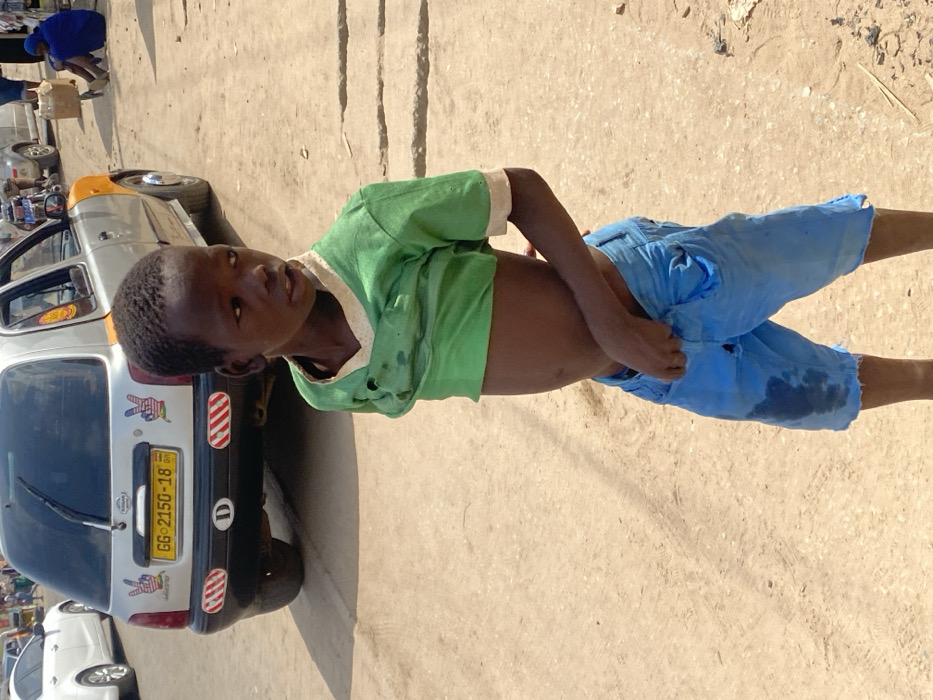 An outdoor, daylight scene in Ablekuma, Ghana, depicts a young male child standing on a dry, unpaved dirt road