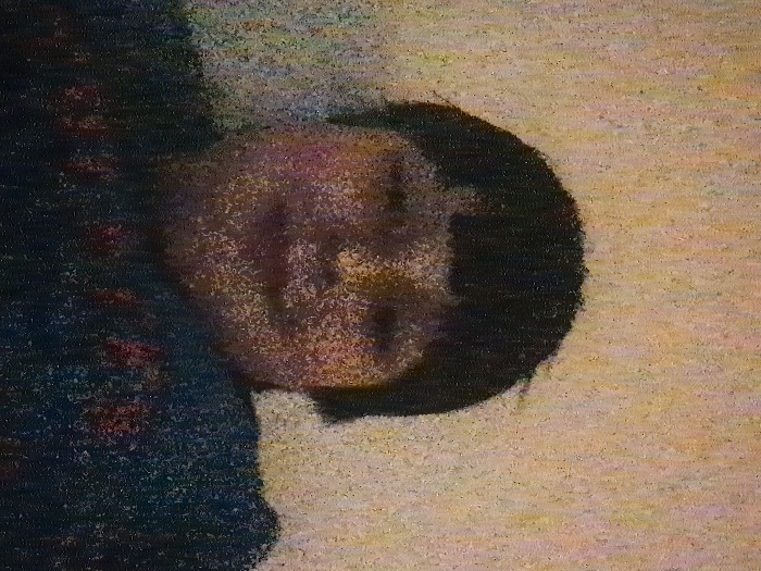 A person lies on a light-colored surface. Their face is visible, surrounded by dark hair. They are partially covered by a dark, patterned fabric or garment. The image is grainy and lacks sharp detail, making specific features indistinct. The person appears to be resting or sleeping.