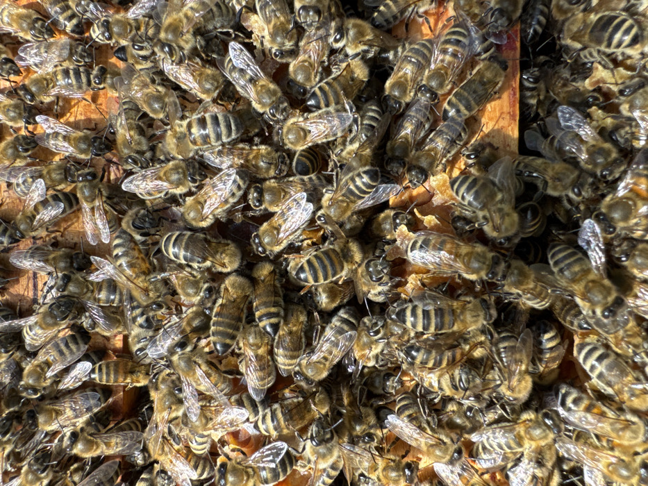 - "The image displays a high-density cluster of live honeybees (Apis mellifera) covering a textured, light brown surface, which appears to be a wooden hive frame or part of a honeycomb" by FM-osXZC2, licensed under CC BY 4.0