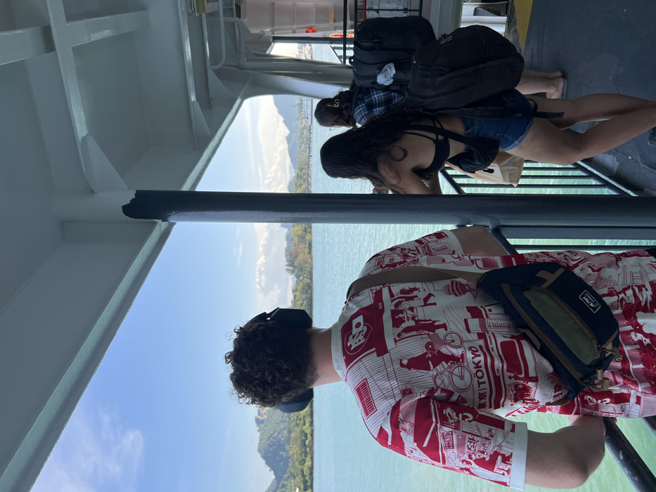 The image captures a scene aboard a ferry in Don Sak, Thailand, under a bright blue sky with scattered clouds. Three individuals are observed from behind, standing on the ferry deck and looking out over turquoise-blue water towards a distant coastline of lush green, hilly land. In the foreground, a male with dark curly hair wears black over-ear headphones and a white short-sleeved shirt patterned with red illustrations of Japanese cityscapes and the word "TOKYO." A navy blue and olive green fanny pack is worn across his back. He is leaning against a dark railing on the left. To his right, a female with long dark hair, dressed in a black bralette-style top and denim shorts, also leans against a dark railing, facing the same direction. She carries a black backpack and a light-colored tote bag. Partially visible behind her is another person with dark hair, wearing a plaid shirt and carrying a large black travel backpack. The ferry's internal structure features a white ceiling, white support beams, and a dark vertical support column on the right. The deck surface is dark grey, with a yellow marking visible on the far right. The distant landscape consists of multiple green, tree-covered hills or mountains, indicative of a tropical or subtropical coast.