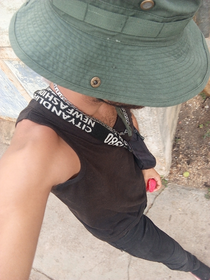 An individual is depicted outdoors in Tinaquillo, Venezuela, viewed from a high-angle perspective. The subject wears a dark green boonie hat, obscuring their upper face, though a beard or stubble is visible on the lower face. They are dressed in a dark sleeveless tank top and dark trousers. A black strap with white lettering reading "CITY AND LIFE NEW FASHION 380" is worn across the left shoulder, from which a small black pouch hangs. A silver-colored chain necklace is visible around the neck. The individual holds a small, rectangular red object in their right hand. The environment consists of a concrete ground surface, bordered by a concrete curb or wall. Beyond this, an unpaved area features dirt, small stones, and sparse green vegetation, including a small, light green spherical object.
