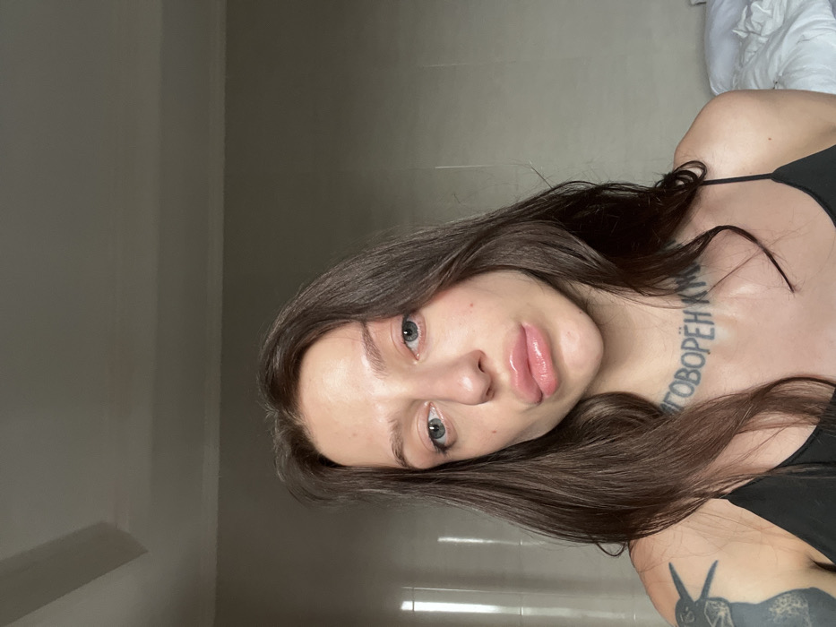 A close-up portrait of a female individual is presented, located in a room within Tibubeneng, Indonesia. The subject is a young adult female with long, dark brown hair, light blue eyes, and a light complexion. She has full lips, slightly parted in a pouting expression, and is looking directly at the camera. She wears a black spaghetti-strap top. Visible tattoos include Cyrillic script on her throat, partially readable as "ГОВОРЁН К", and a dark, stylized depiction of a bird, possibly a raven, with an open beak on her left upper arm. The background consists of plain light gray walls, with vertical paneling or tiling visible on the left side and crumpled white fabric, likely bedding, visible on the far right. The ceiling is also visible at the top of the frame. The lighting is soft and even, consistent with an indoor environment.