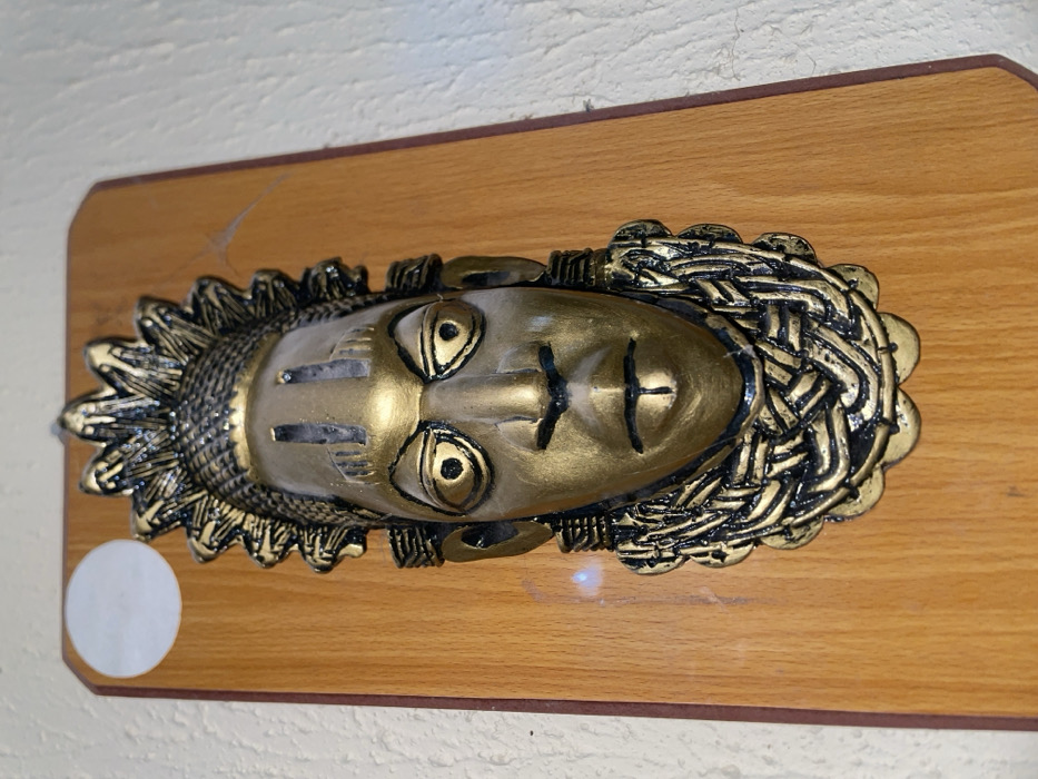 A golden African mask is mounted on a rectangular wooden board. The mask features prominent eyes and nose. Ornate details surround the face, resembling either a headdress or sun rays. A white circular sticker is attached to the lower-left corner of the board. The background appears to be a neutral-colored wall. The board itself has rounded corners and a thin, dark border.