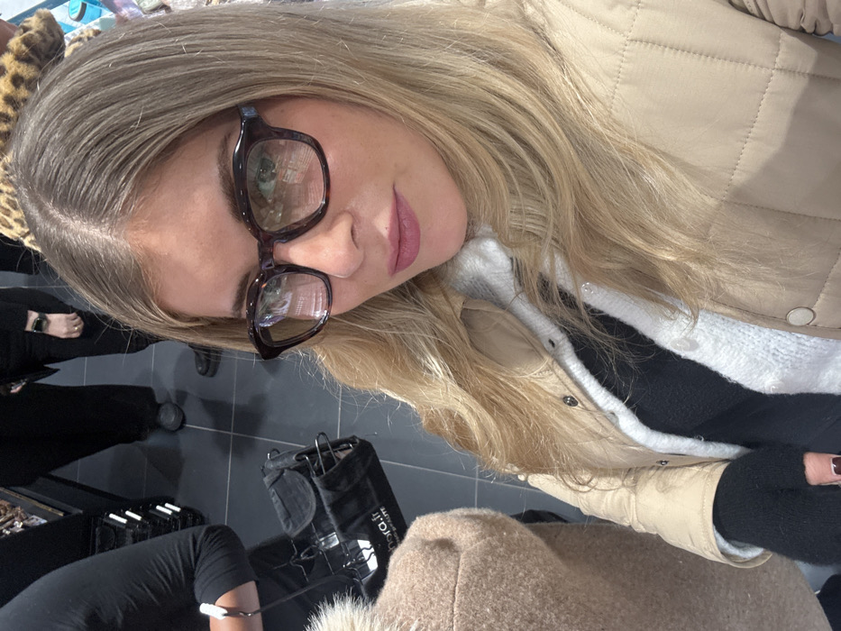 A woman with blonde hair, wearing glasses, a beige jacket over a black and white top, poses for a selfie. The background features a black floor, makeup bags, and what appears to be a makeup artist dressed in black. Another person's leg is partially visible. The lighting seems to be from above, casting slight shadows. The woman's expression is neutral.