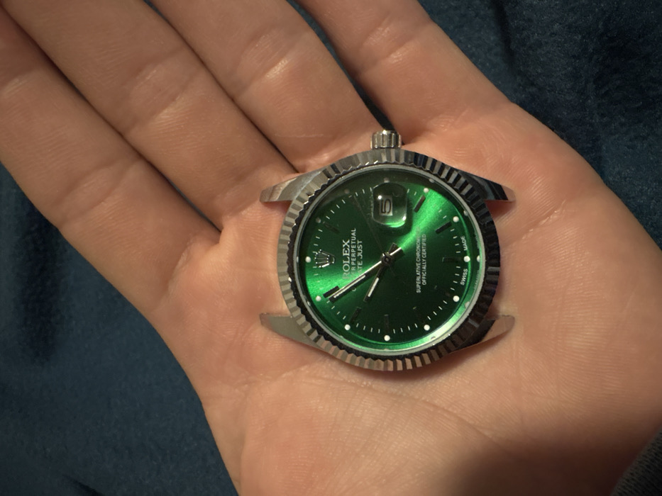 - "A single human hand, appearing to be an adult's left palm, is centered in the frame, holding a Rolex watch dial and bezel assembly" by FM-2RVs73, licensed under CC BY 4.0